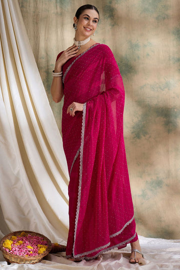Saree color - Rani pink. Fabric - Vichitra silk. Work/Pattern - Heavy designer swarovski diamond...