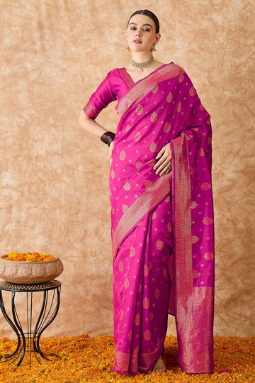 Saree color - Rani pink. Fabric - Banarasi silk. Work/Pattern - Zari weaving with stylish...
