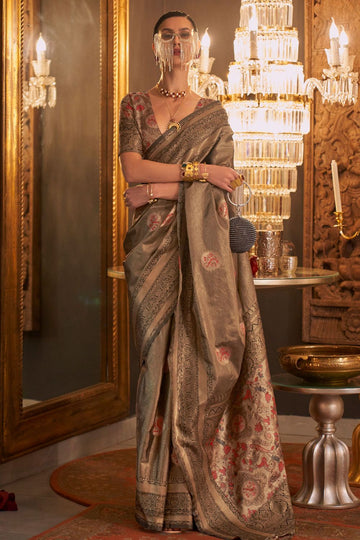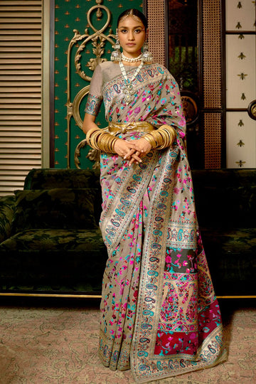 Saree color - Dusty grey. Fabric - Handloom silk. Work/Pattern - Kashmiri weaving. Saree Length...