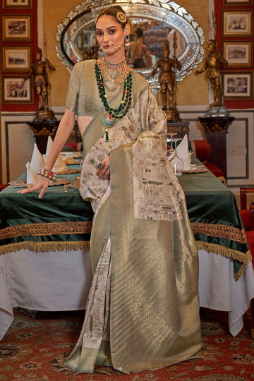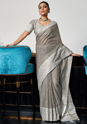 Saree color - Dusty grey. Fabric - Tussar silk. Work/Pattern - Digital printed zari border...