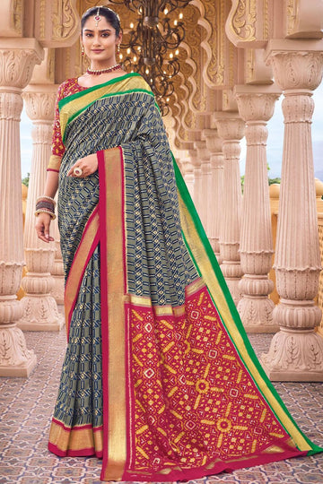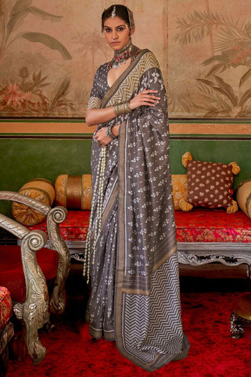 Saree color - Dusty grey. Fabric - Silk. Work/Pattern - Printed. Blouse Color - Dusty...