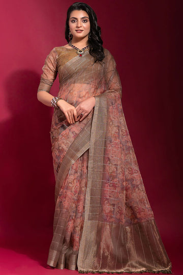 Saree color - Dusty peach. Fabric - Linen silk. Work/Pattern - Zari checks saree with...