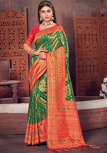 Saree color - Forest green. Fabric - Patola silk. Work/Pattern - Weaving. Blouse Color -...