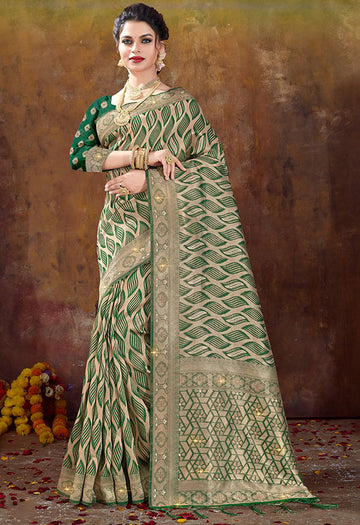 Saree color - Forest green. Fabric - Organza. Work/Pattern - Weaving. Blouse Color - Forest...