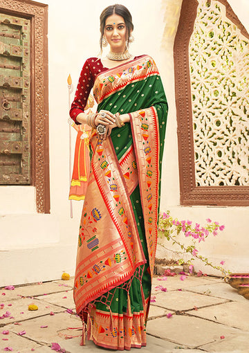 Saree color - Forest green. Fabric - Paithani silk. Work/Pattern - Weaving. Blouse Color -...