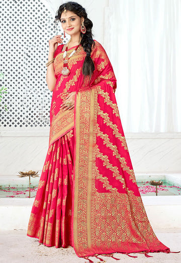 Saree color - Fuchsia. Fabric - Banarasi silk. Work/Pattern - Weaving. Blouse Color - Fuchsia....