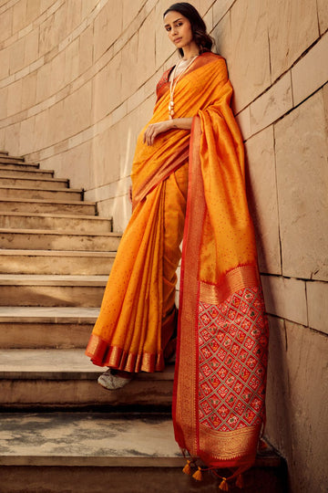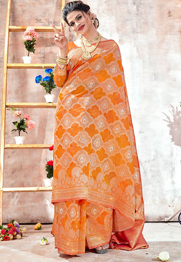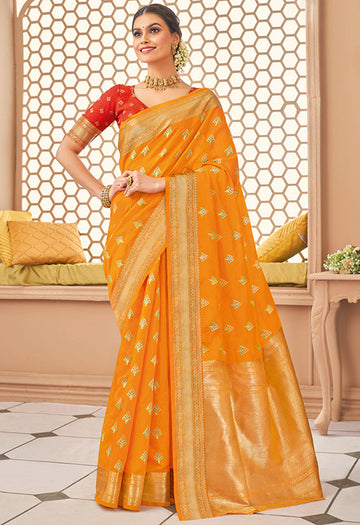 Saree color - Golden orange. Fabric - Organza. Work/Pattern - Weaving. Blouse Color - Golden...