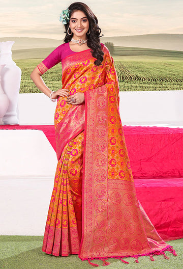 Saree color - Golden orange. Fabric - Kanjivaram silk. Work/Pattern - Weaving. Blouse Color -...