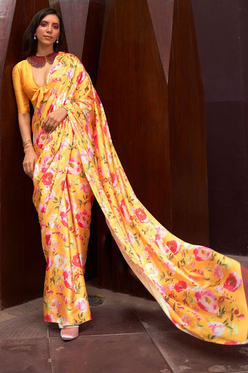 Saree color - Golden yellow. Fabric - Satin crepe. Work/Pattern - Floral print. Saree Length...