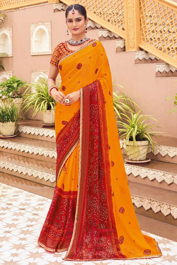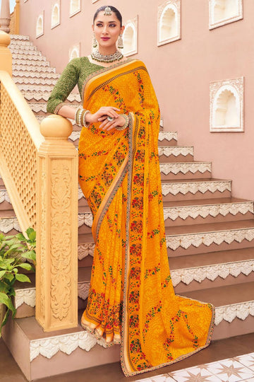 Saree color - Golden yellow. Fabric - Chiffon. Work/Pattern - Digital print with matching lace...