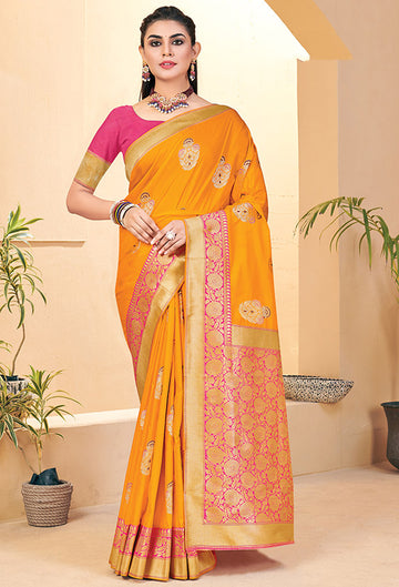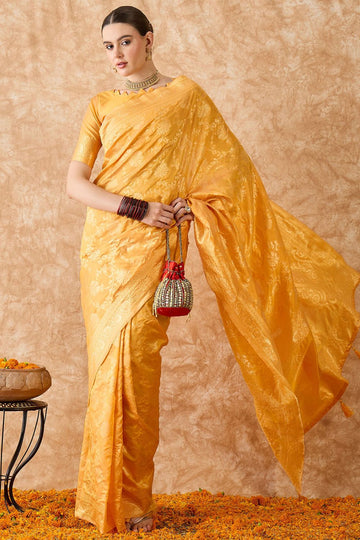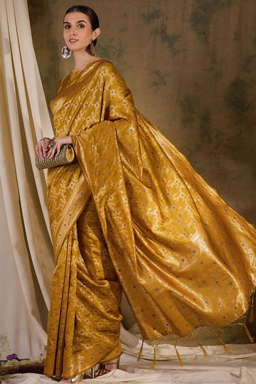 Saree color - Golden yellow. Fabric - Banarasi silk. Work/Pattern - Weaving. Blouse Color -...