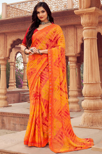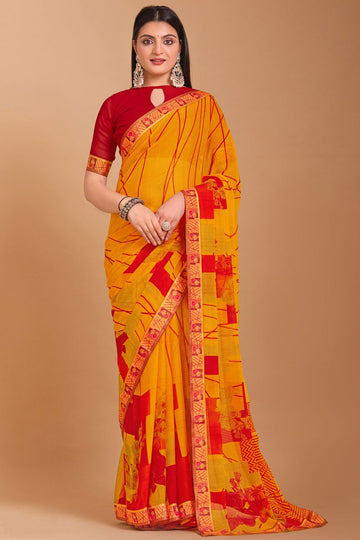 Saree color - Golden yellow. Fabric - Saree : Georgette chiffon ; Blouse : Brocade.....