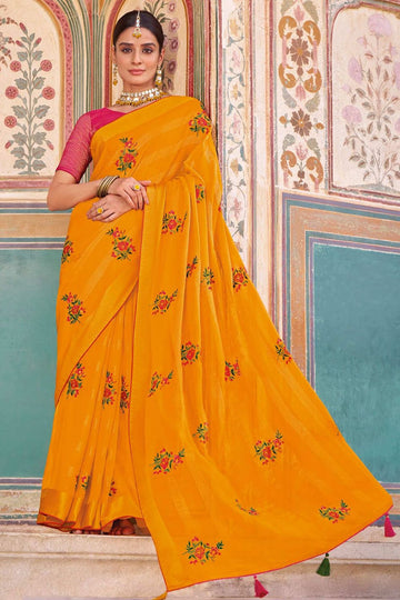 Saree color - Golden yellow. Fabric - Weaving chiffon. Work/Pattern - Floral motifs. Saree Length...