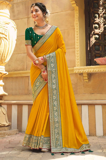 Saree color - Golden yellow. Fabric - Vichitra silk. Work/Pattern - Zari embroidery with lace...