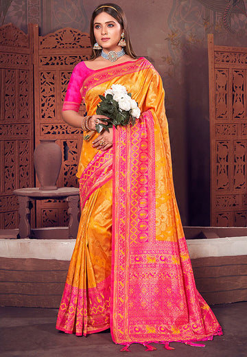 Saree color - Golden yellow. Fabric - Patola silk. Work/Pattern - Weaving. Blouse Color -...