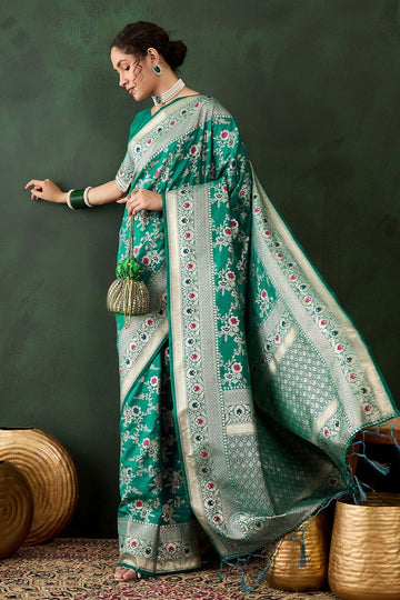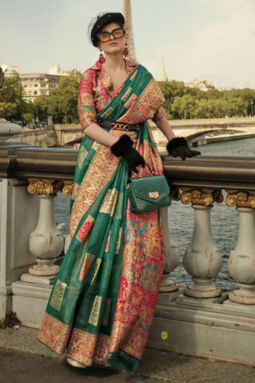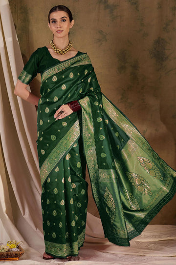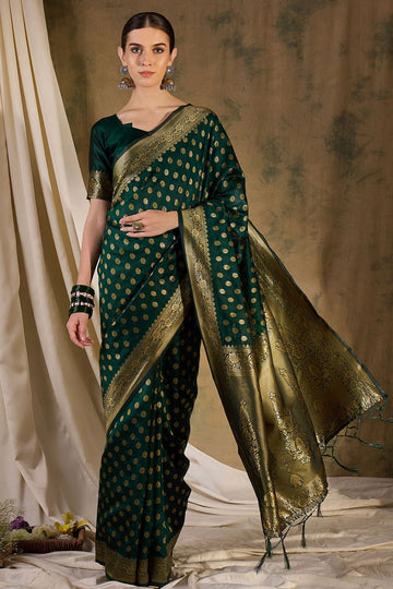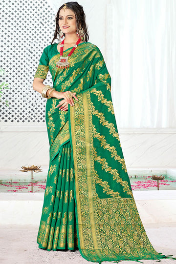 Saree color - Green. Fabric - Banarasi silk. Work/Pattern - Weaving. Blouse Color - Green....