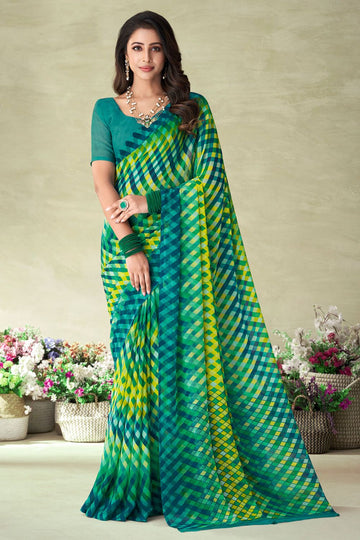 Saree color - Green. Fabric - Chiffon. Work/Pattern - Printed. Blouse Color - Green. Saree...