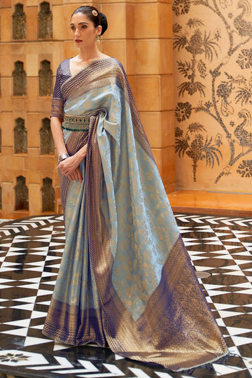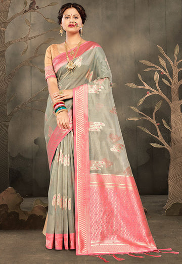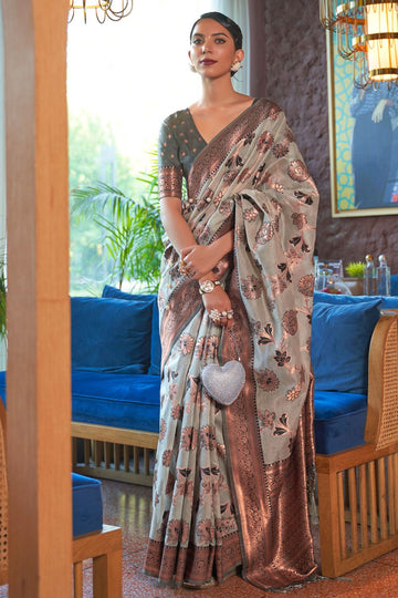 Saree color - Grey. Fabric - Shimmer organza silk. Work/Pattern - Copper zari weaving work....