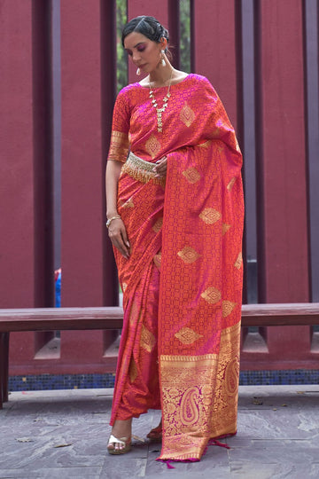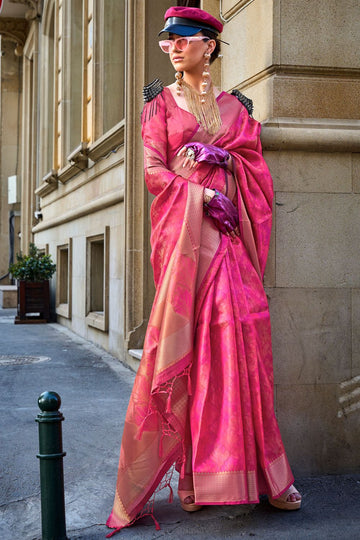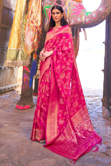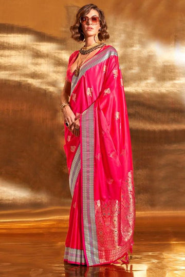 Saree color - Hot pink. Fabric - Silk. Work/Pattern - Weaving. Blouse Color - Hot...