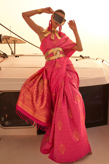 Saree color - Hot pink. Fabric - Satin self paste 2 tone. Work/Pattern - Handloom...