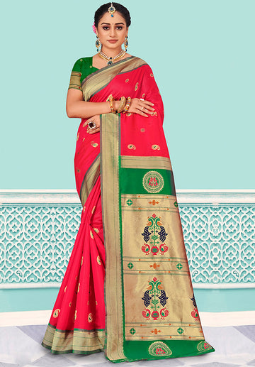 Saree color - Hot pink. Fabric - Paithani silk. Work/Pattern - Weaving. Blouse Color -...