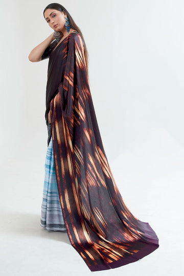 Saree color - Ice blue and oak brown. Fabric - Satin. Work/Pattern - Digital print....