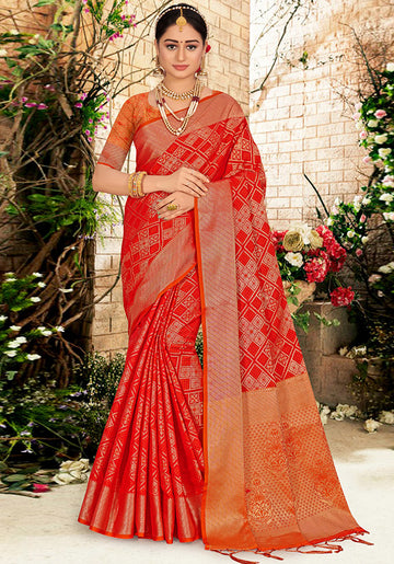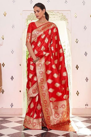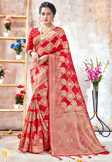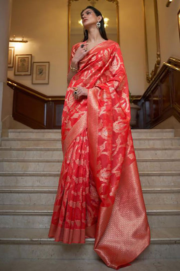 Saree color - Hot red. Fabric - Organza. Work/Pattern - Weaving. Blouse Color - Hot...