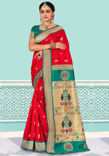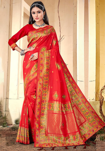 Saree color - Hot red. Fabric - Silk. Work/Pattern - Weaving. Blouse Color - Hot...