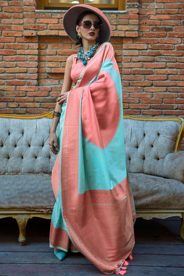 Saree color - Ice blue and puce pink. Fabric - Silk. Work/Pattern - Handloom weaving....