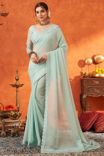 Saree color - Ice blue. Fabric - Chiffon silk. Work/Pattern - Embroidered patch border. Saree...