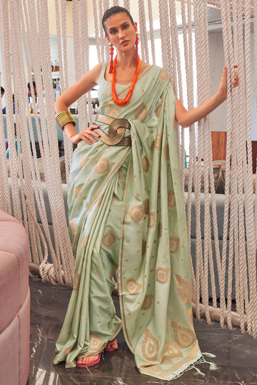 Saree color - Ice mint. Fabric - Silk. Work/Pattern - Pure copper zari weaving. Saree...