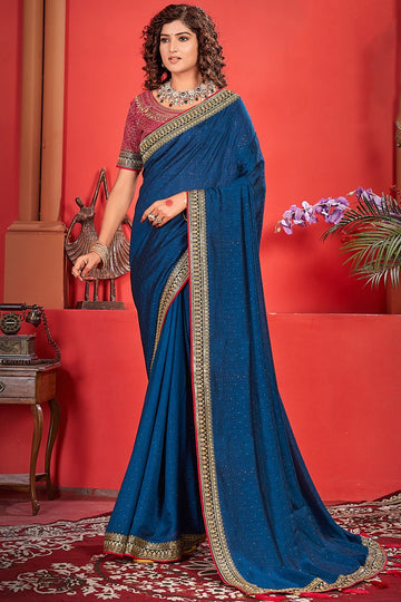 Saree color - Indigo blue. Fabric - Vichitra silk. Work/Pattern - Zari and sequins embroidery...