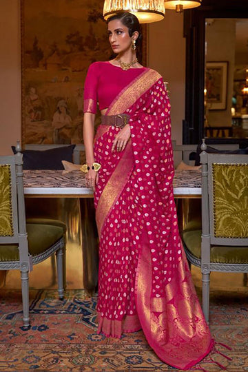 Saree color - Raspberry pink. Fabric - Hand spun cotton silk. Work/Pattern - Zari weaving....