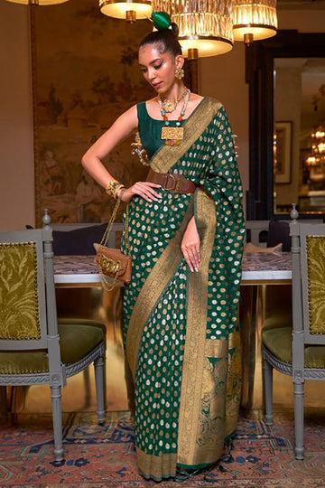 Saree color - Bottle green. Fabric - Hand spun cotton silk. Work/Pattern - Zari weaving....