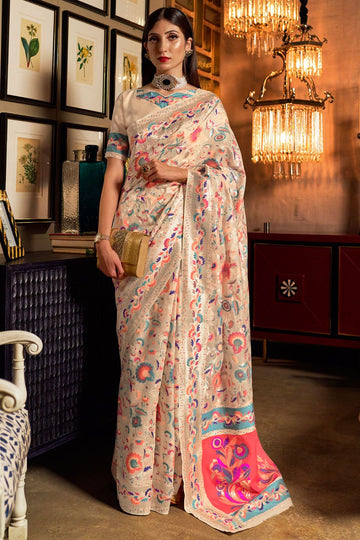 Saree color - Bisque cream. Fabric - Silk. Work/Pattern - Pure Kashmiri modal weaving. Saree...