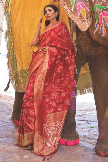 Saree color - Cherry red. Fabric - Soft handloom silk. Work/Pattern - Weaving, sequins and...