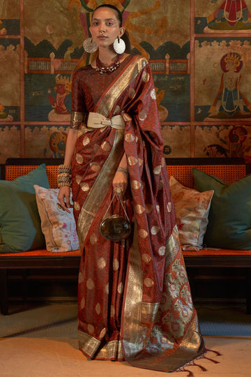 Saree color - Garnet. Fabric - Pure satin tanchoi. Work/Pattern - Handloom weaving. Saree Length...