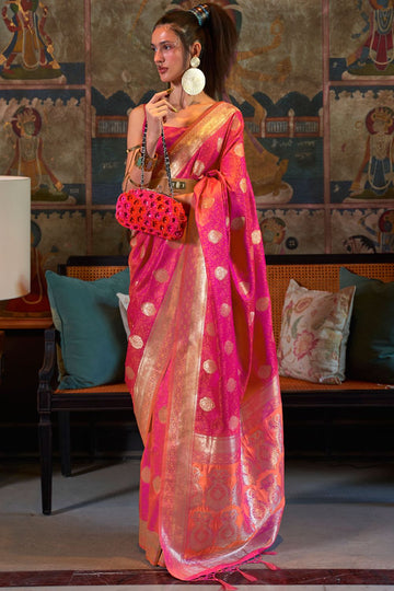 Saree color - Hot pink. Fabric - Soft handloom silk. Work/Pattern - Weaving, sequins and...