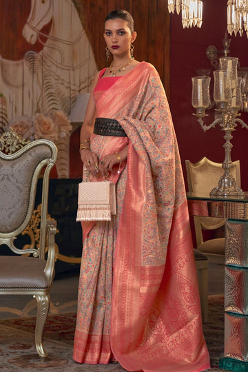Saree color - Rose pink. Fabric - Silk. Work/Pattern - Kashmiri chaap handloom weaving. Saree...