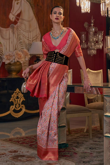 Saree color - Salmon pink. Fabric - Satin tissue nylon. Work/Pattern - Handloom weaving. Saree...