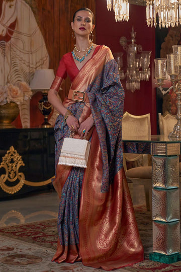 Saree color - Dusty grey. Fabric - Silk. Work/Pattern - Kashmiri chaap handloom weaving. Saree...