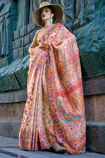 Saree color - Peach. Fabric - Organza. Work/Pattern - Kashmiri handloom weaving. Saree Length -...