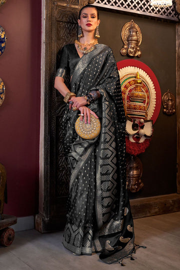 Saree color - Black. Fabric - Pure satin. Work/Pattern - Handloom weaving with tassles on...