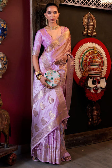 Saree color - Lilac pink. Fabric - Pure satin. Work/Pattern - Handloom weaving with tassles...