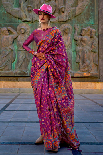 Saree color - Magenta. Fabric - Organza. Work/Pattern - Kashmiri handloom weaving. Saree Length -...