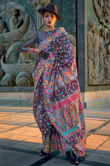 Saree color - Midnight blue. Fabric - Organza. Work/Pattern - Kashmiri handloom weaving. Saree Length...