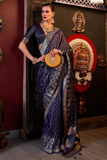 Saree color - Midnight blue. Fabric - Pure satin. Work/Pattern - Handloom weaving with tassles...