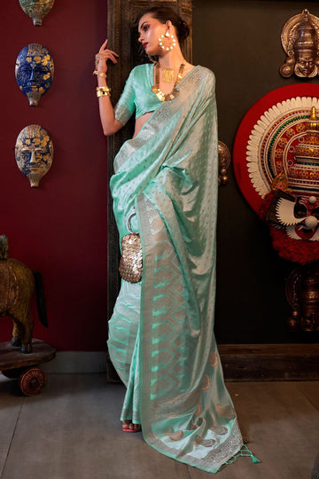 Saree color - Turquoise. Fabric - Pure satin. Work/Pattern - Handloom weaving with tassles on...