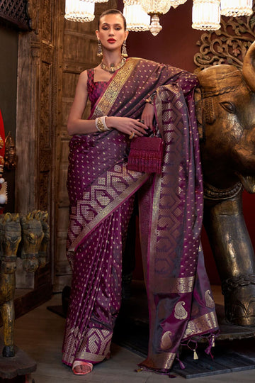 Saree color - Burgundy. Fabric - Pure satin. Work/Pattern - Handloom weaving with tassles on...