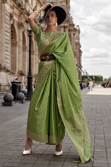 Saree color - Lime green. Fabric - Pure satin chaap silk. Work/Pattern - Handloom weaving....